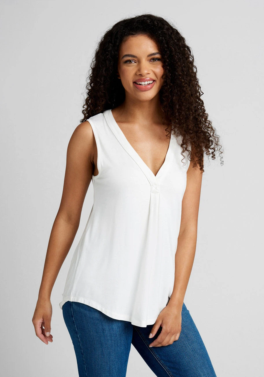 As the new season approaches, you find yourself opting for lighter knits, like this ModCloth namesake label sleeveless top! What sets this ivory, woven-trim piece apart from the rest? Its stretchy fabrication, curved hem, shirred detailing at the back, and endless styling options.