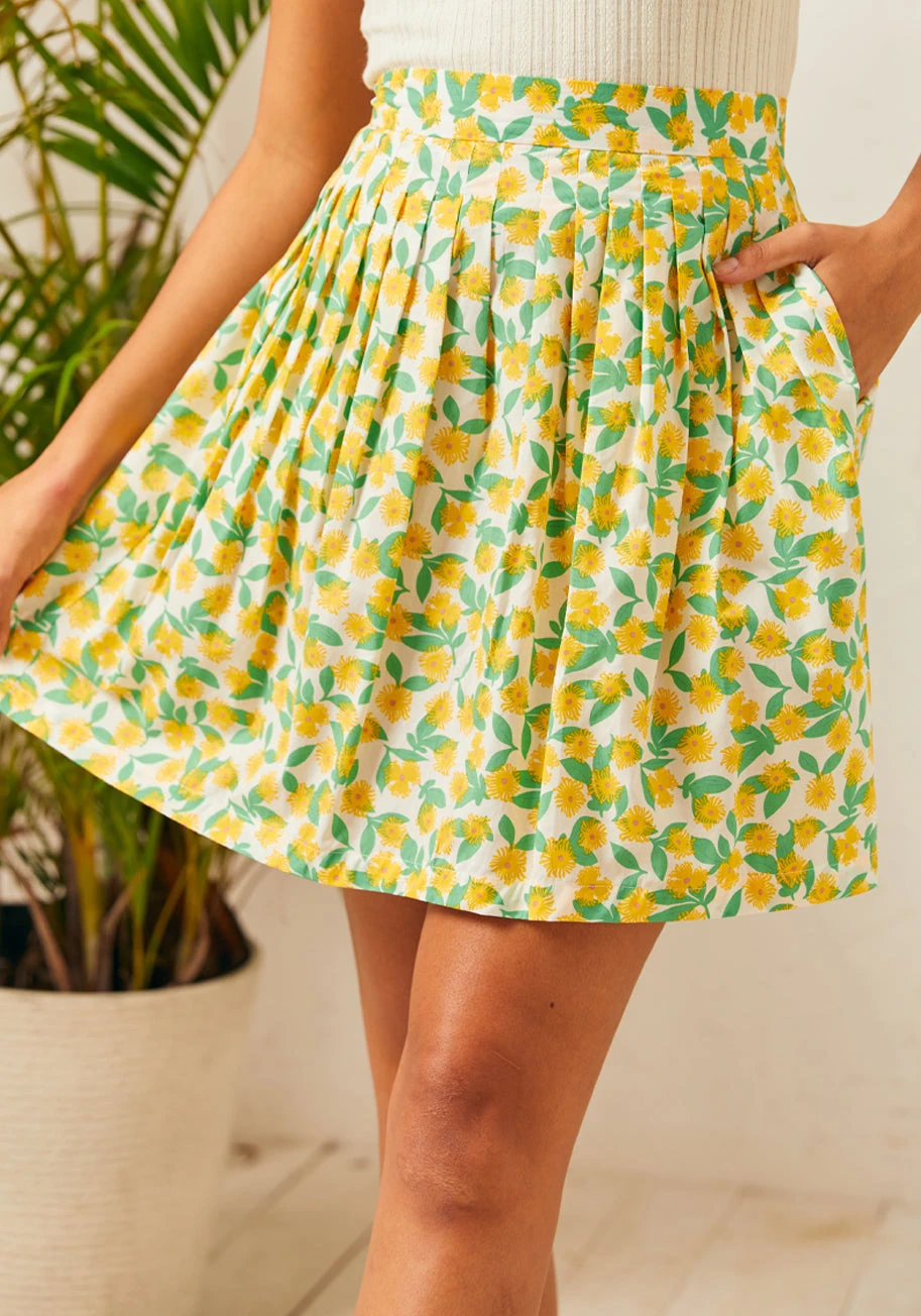 Welcome the sunny days with this flirty, high-waisted mini skirt. Flourishing with a cheerful yellow floral print on breathable cotton, its skater silhouette twirls delightfully with every step. This skirt bursts with the spirit of spontaneous adventure, ideal for sunny afternoon outings or a whimsical date in the city. It’s a ray of sunshine in your wardrobe, ready to brighten any day with its charm.