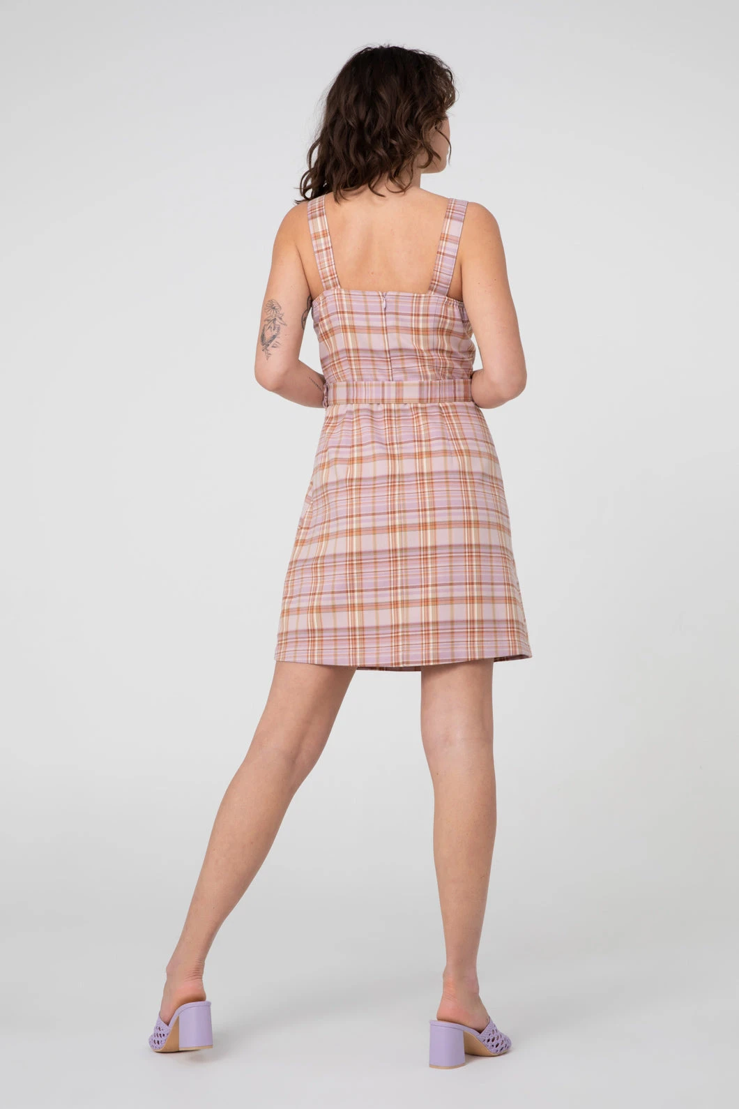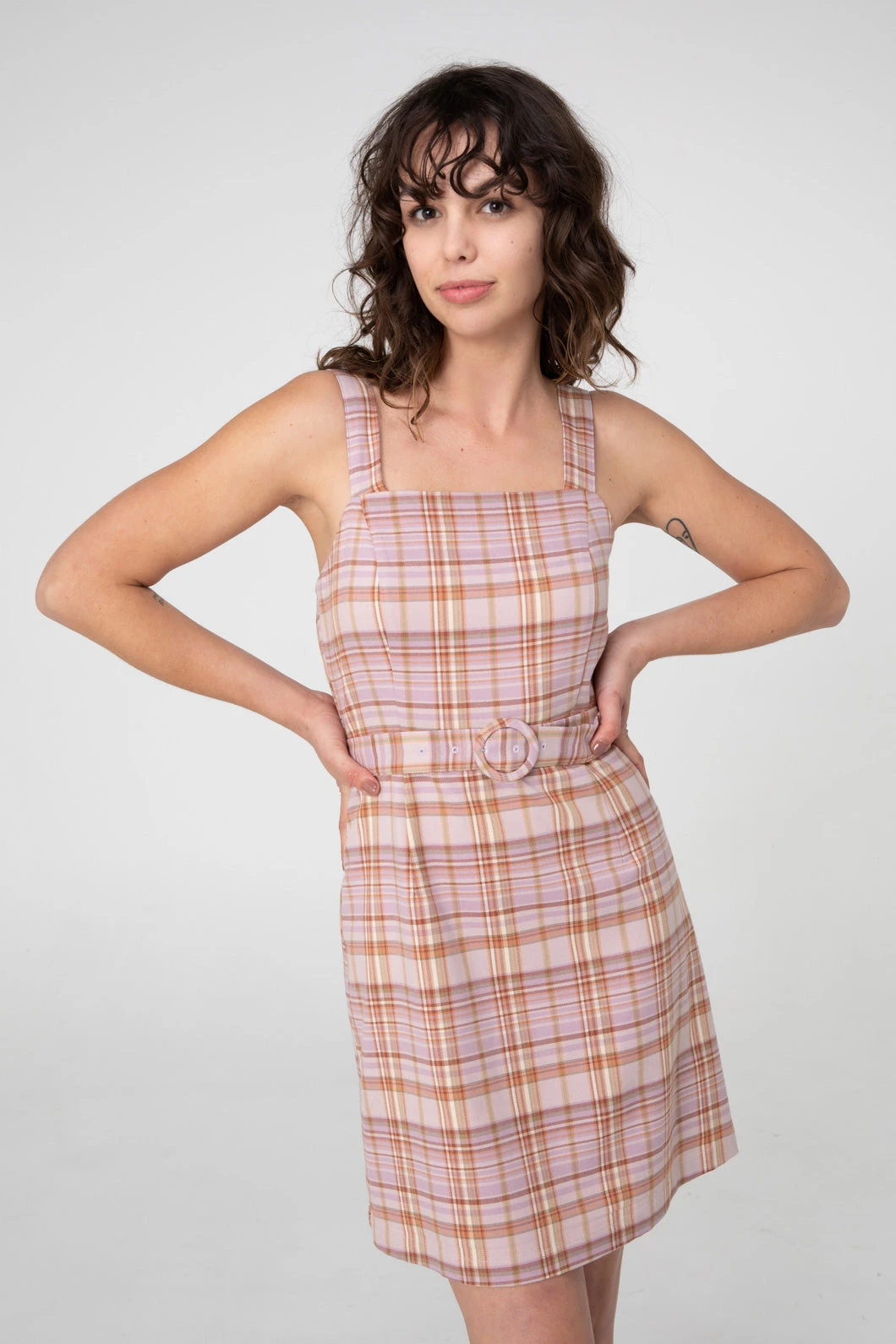 Step into preppy charm with the Chelsea Check Pinny, crafted from a soft tartan fabric with natural stretch. This pinny features a semi-fitted bodice, wide shoulder straps, and an A-line skirt that finishes above the knee, creating a playful, classic silhouette. The dreamy tartan pattern is available in two lovely hues, yellow and lilac, with a matching belt to complete the look.