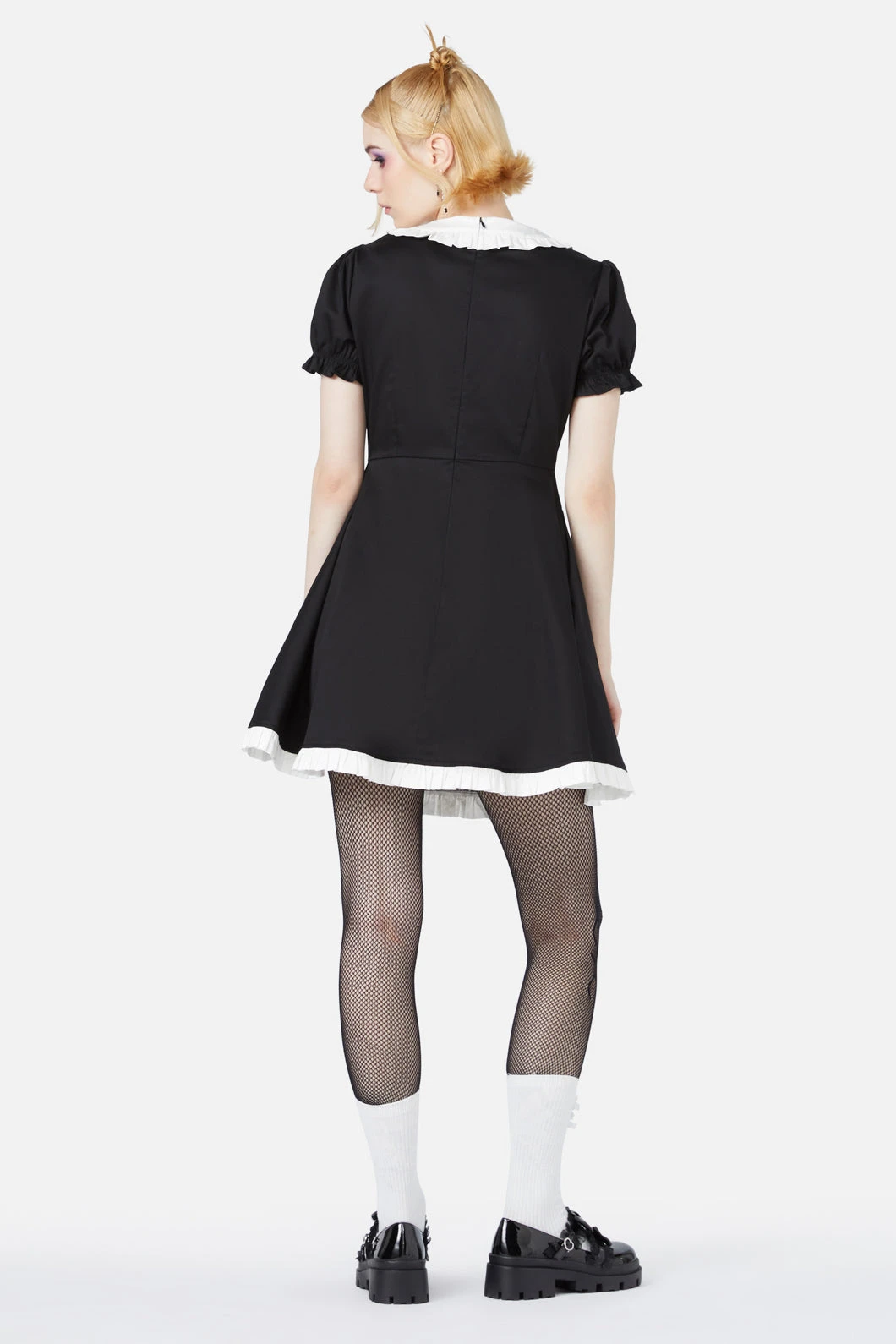 Step into gothic elegance with the Coffin Dress, a striking fit-and-flare piece that channels both dark romance and playful style. This dress features short, gathered sleeves and a fitted bodice that highlights your silhouette, while the flared skirt adds movement and charm. The delicate white frilly trim along the neckline and hem offers a striking contrast against the black, creating a classic yet edgy look.