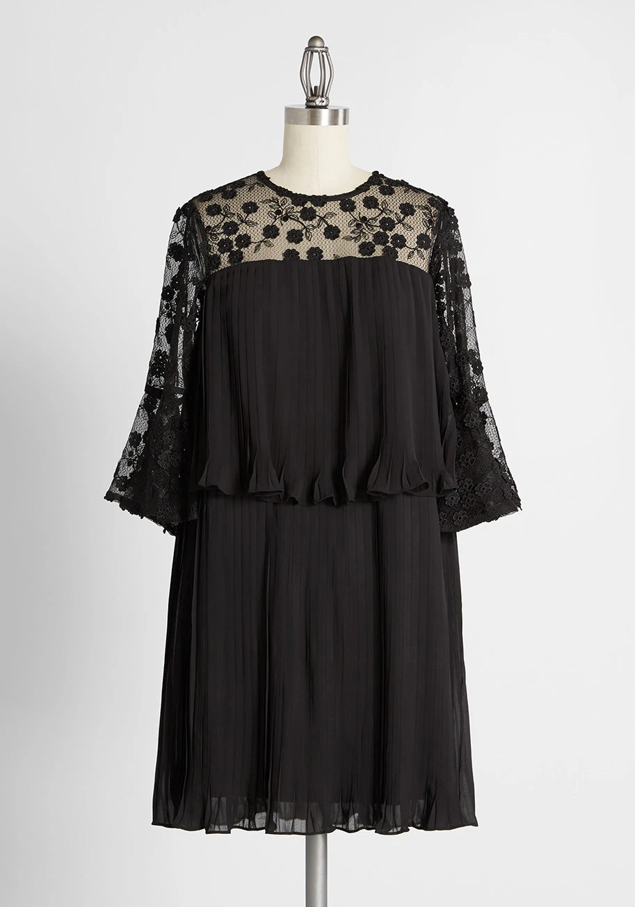 Adorned at the yoke and sleeves with a mesh lace filled with clusters of black floral blooms amidst winding leafy vines, this two-tiered mini dress is a little black dress like no other! Featuring a keyhole button-closure at the back neckline, and sheer ¾ flared sleeves, this tiered silhouette with ruffle edges in solid black chiffon is subtly pleated throughout from below the yoke, making this darling frock one-of-a-kind.