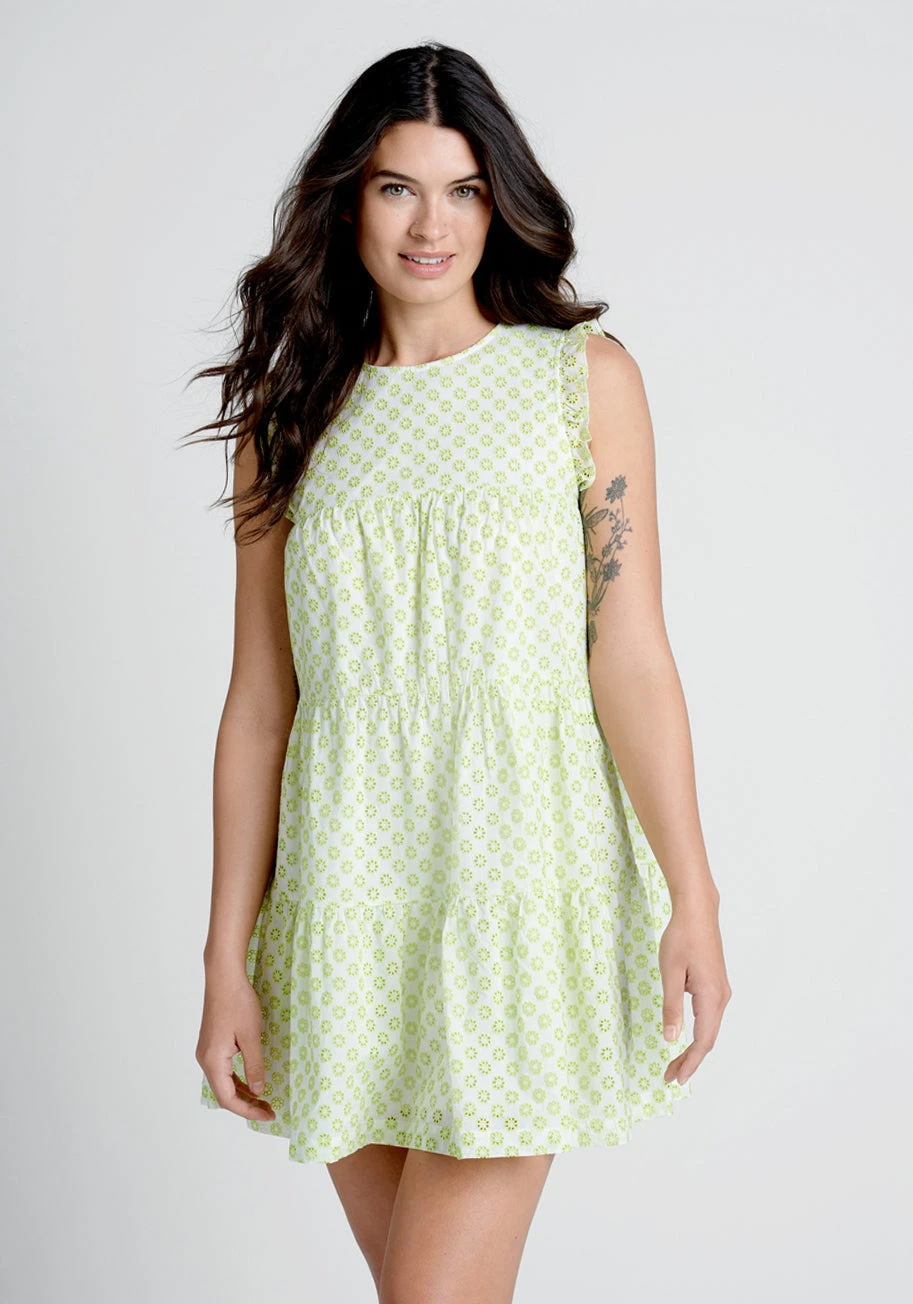 What you choose to do in the flower fields is up to you. But whatever you end up doing, make sure you slip on this mini sundress from our ModCloth namesake label for the full “cottagecore on acid” aesthetic we are loving for spring. Made from a breathable white-hued woven cotton fabric that is covered all over in an exclusive, bright acid green-hued embroidered floral eyelet pattern that makes this trapeze silhouette idyllic for wearing to that whimsical picnic on the prairie, or wherever you can catch some rays and gather with pals. With such a unique, stand out fabrication with intricate miniature flowers scattered all over that you will cherish forever, you can almost be certain you’ll be tripping over the other details this tiered shift has to offer. 1970s prairie-chic vibes are highlighted with the frilly ruffles at the sleeveless arm openings, delicate shirring throughout the tiered silhouette that adds some romantic essence, and a deep keyhole with a button-loop closure at the back. This vintage-inspired piece pairs lovely with your favorite sandals or even minimal sneakersâ”but we really think this relaxed fit babydoll dress is best worn barefoot while spinning and frolicking in flower fields among the prairie-like countryside while seeing colors you never knew existed.
