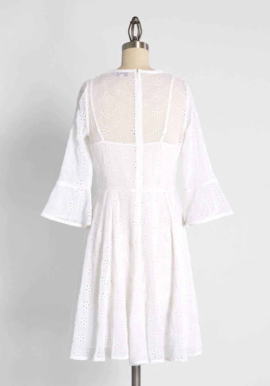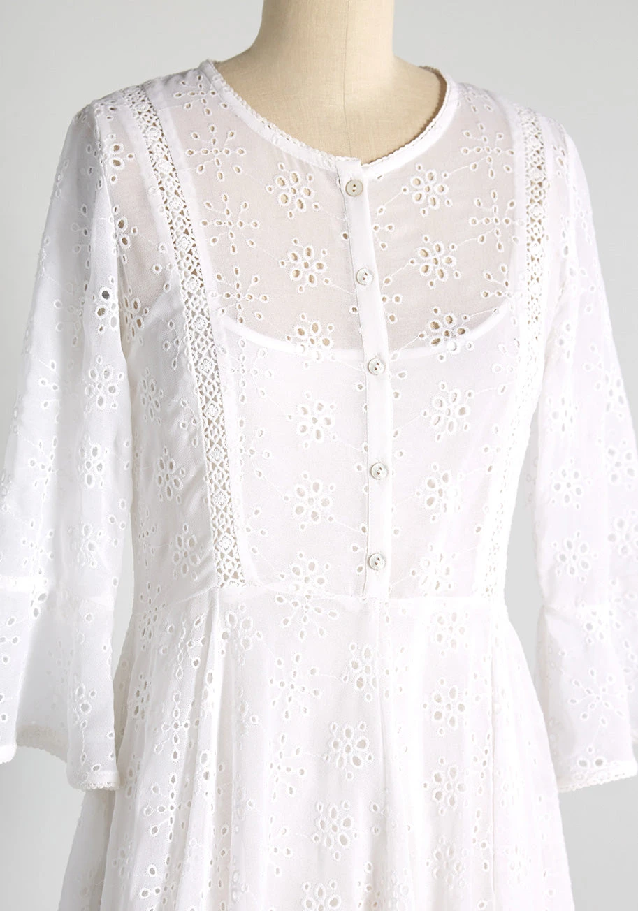 Meadow bound mavens and field searching starlets, turn your compass to this white eyelet mini dress by Amelia Rose to set your aesthetic free. Made of a crisp cool cotton, this mini dress is designed with a slip underneath, a placket of dainty buttons down the bodice, and a light-as-air bell sleeve with a slight flounce. Featuring an eyelet motif pattern all over and crocheted trim, this fresh summer dress is easily styled with neutral espadrilles or sandals.