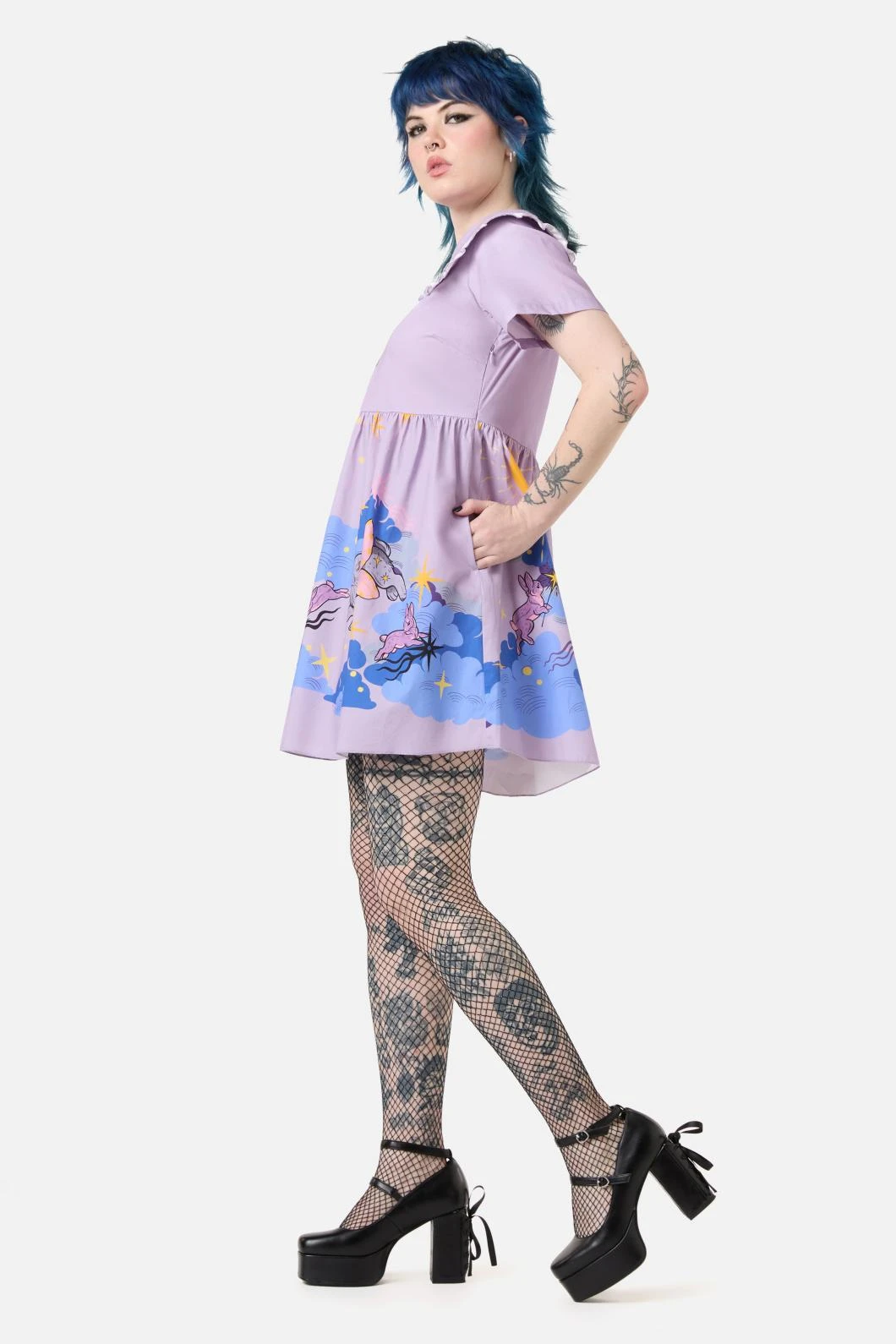 Drift into dreamland with the Goodnight Bunny Border Dress by Dangerfield—a babydoll-style beauty that blends sweet whimsy with gothic charm. Featuring a relaxed fit, gathered skirt, and short sleeves, it’s both comfy and cute.