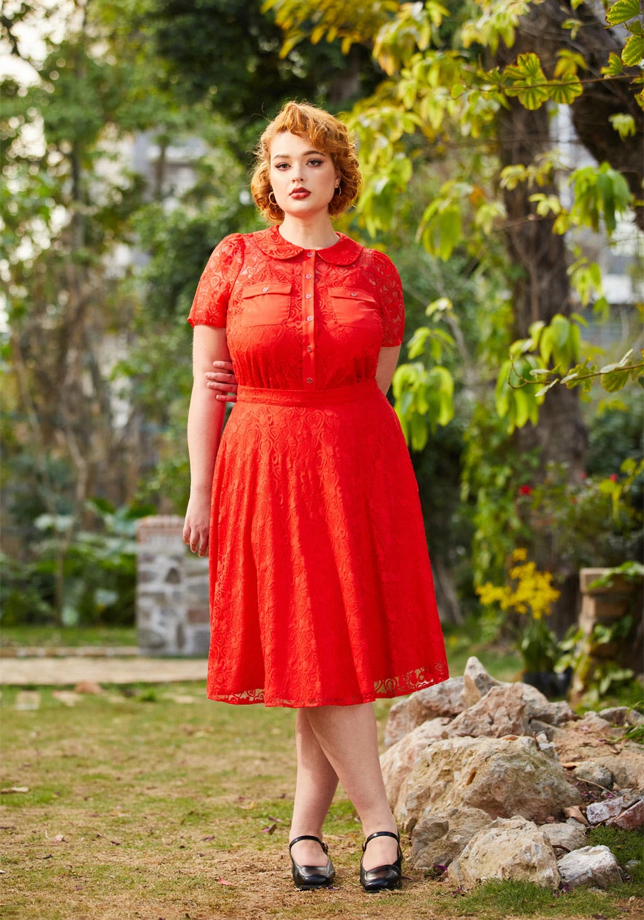 Complete with a matching cami, this blazing red button-up top from our ModCloth namesake label makes our hearts go boom! So beautiful to style tucked into your favorite skirt or worn over jeans, this vintage-inspired blouse boasts a sheer, lace overlay with an exclusive hearts design throughout! Featuring short sleeves with shirring at the shoulders, a lined Peter Pan collar, white button-up closure, and solid red pockets at the chest with flap button closure, this vivacious red blouse is truly unique.