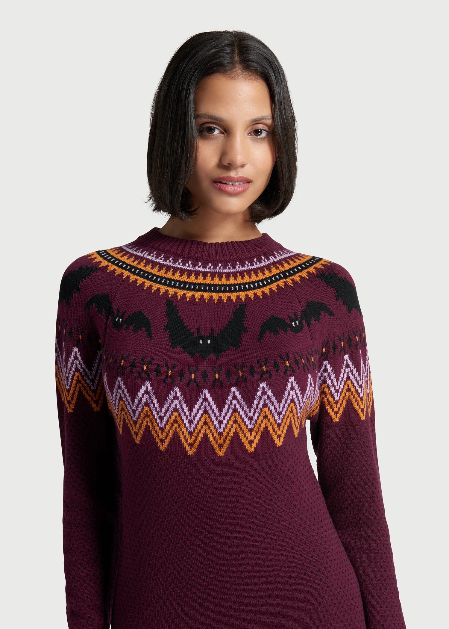 Quirky and ‘bat’ to the bone, this plum-hued Fair Isle sweater dress from our ModCloth namesake is retro-boo-tiful with its exclusive Fair Isle pattern at the yoke featuring flapping black bat motifs that are framed by orange and white stripes, dots, and zig-zags, along with black polka-dots scattered all over. Made from a super soft cotton knit, this pullover sweater dress is a classic crew neck cut that finishes above the knee with an easy fit that is ideal for cool-weather layering year-round!