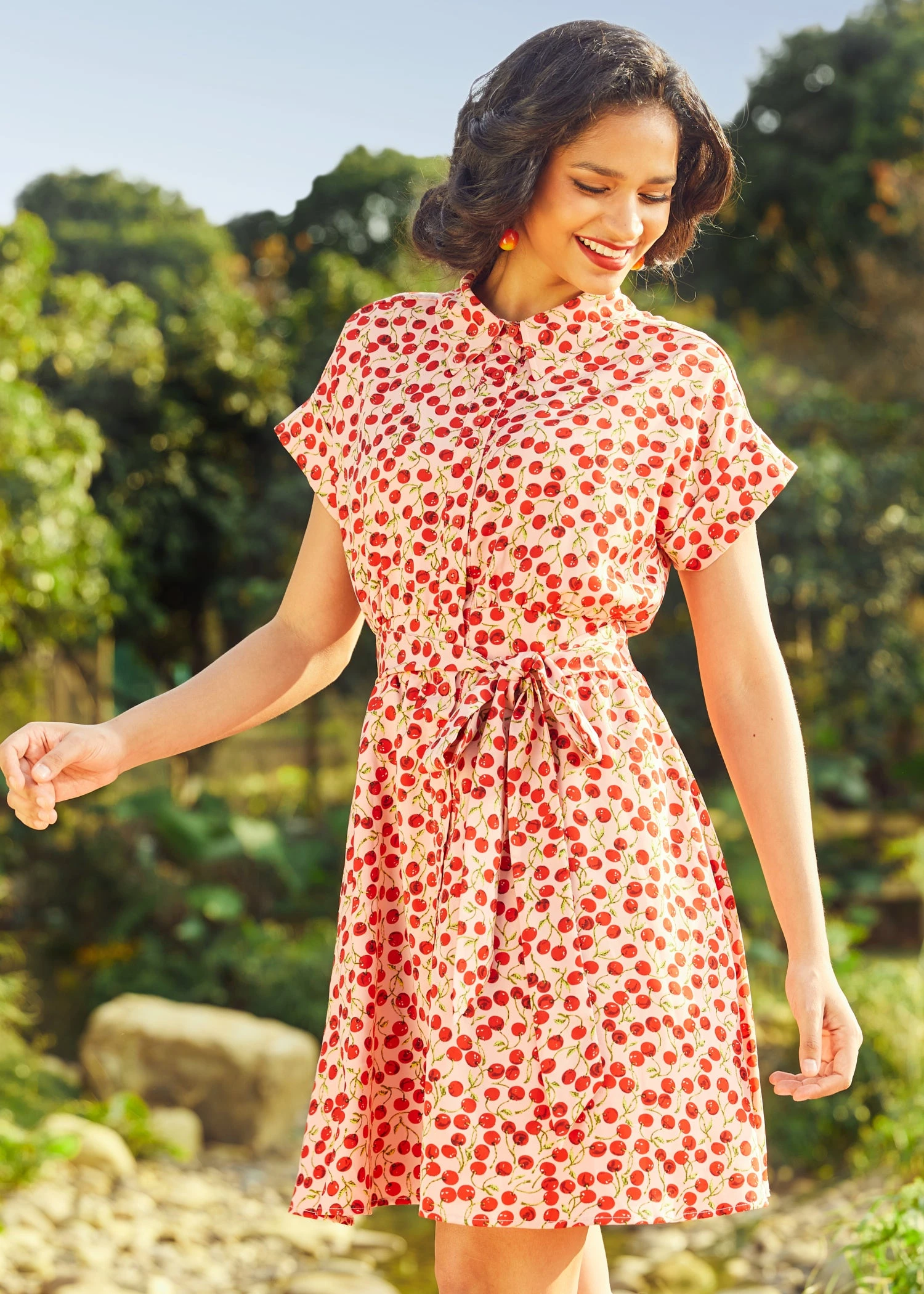 Swing into the refreshing season with the Jazz Age Jive Shirt Dress in a charming Cherry Kiss print from our ModCloth namesake label. Vibrant cherry motifs dance across the fabric, while a button front, elastic waist, and roomy pockets marry function with flapper-inspired fashion. The pullover style provides ease of wear, making it a breeze to look fabulous at jazz brunches or casual picnics in the park. Don this vintage-inspired frock for effortless style that makes every moment sweeter.