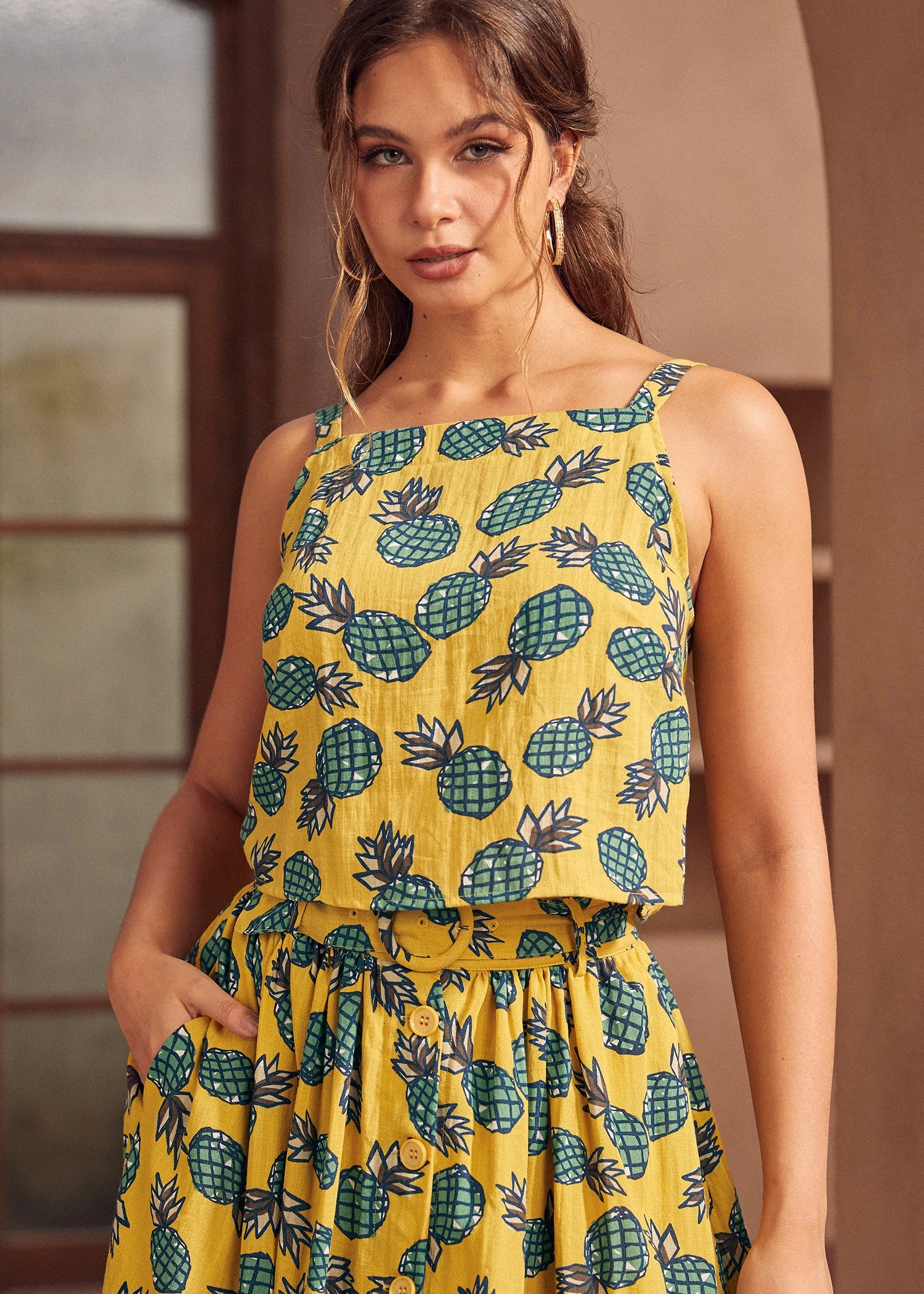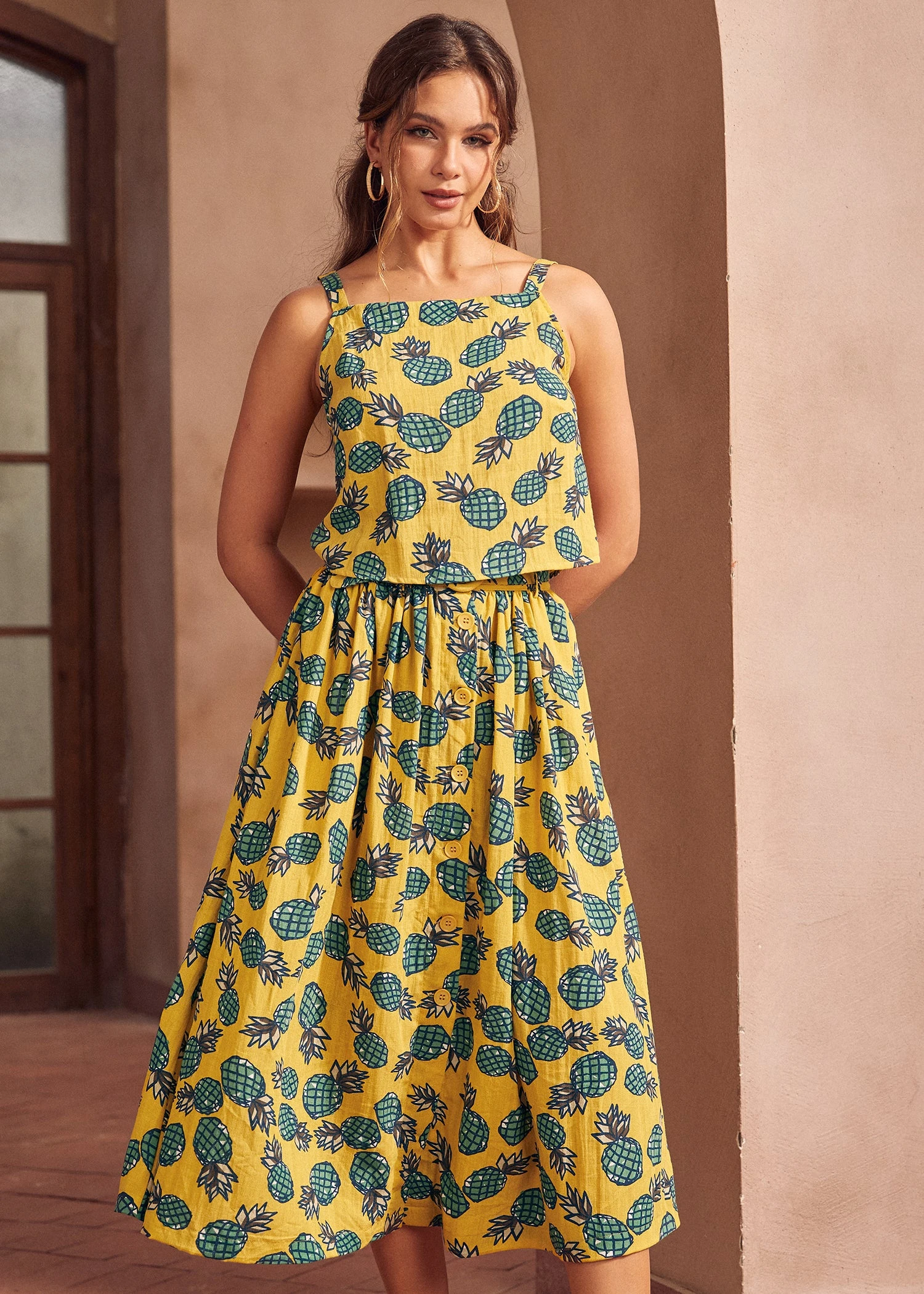 Dive into summer’s sweet embrace with this playful pineapple print tank top from our ModCloth namesake label. Crafted from breezy fabric, it’s a homage to sun-drenched days and balmy nights. The slender spaghetti straps offer a delicate touch while ensuring comfort, and at the back, a row of buttons adds a dash of unexpected charm.