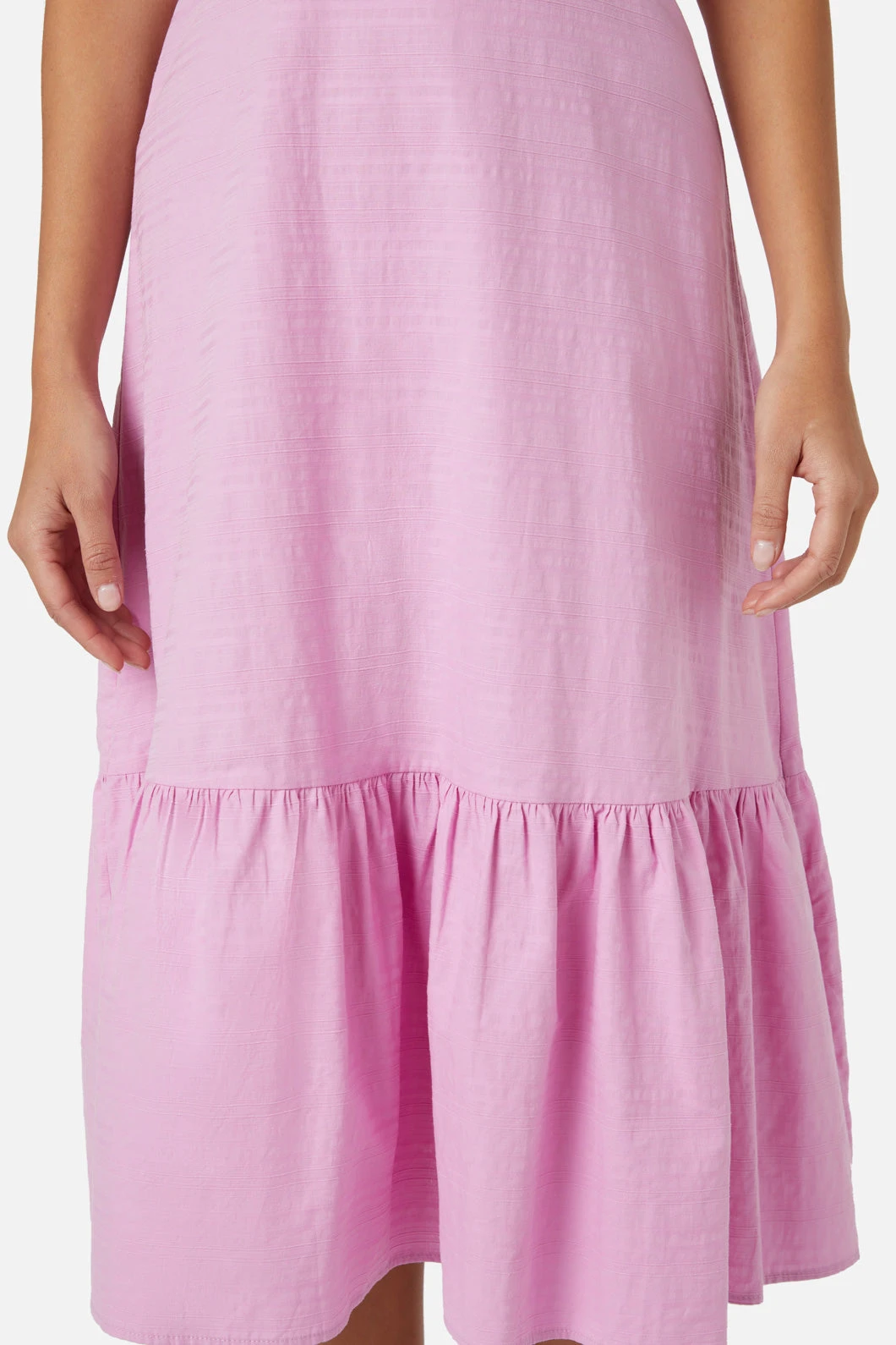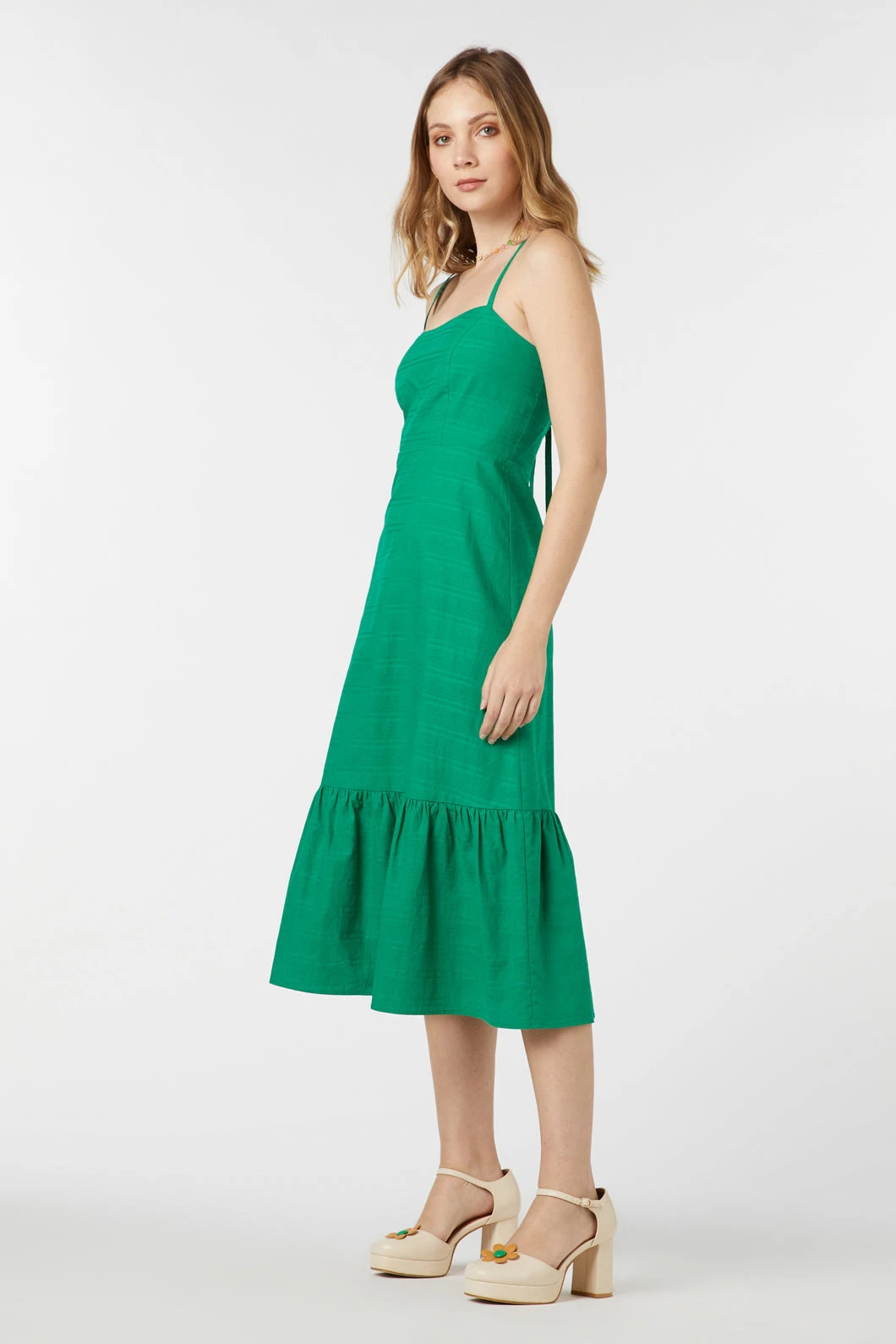 Twirl your way into the sunshine with the Perri Dress, where fun meets bold in a whirlwind of midi-length joy. This bright sundress isn’t just about turning heads—it’s about stealing hearts with its playfully sweet cross-back. The romance of the wide ruffle at the hem dances with each step, while the fitted bodice, sculpted with soft princess line shaping, hugs your curves in all the right ways. Turn around to reveal a soft V shaping at the back, elegantly framed by an invisible zipper that keeps everything sleek and in place. Perfect for a picnic, a party, or just painting the town your favorite shade of fabulous, the Perri Dress is a sundrenched dream come true.