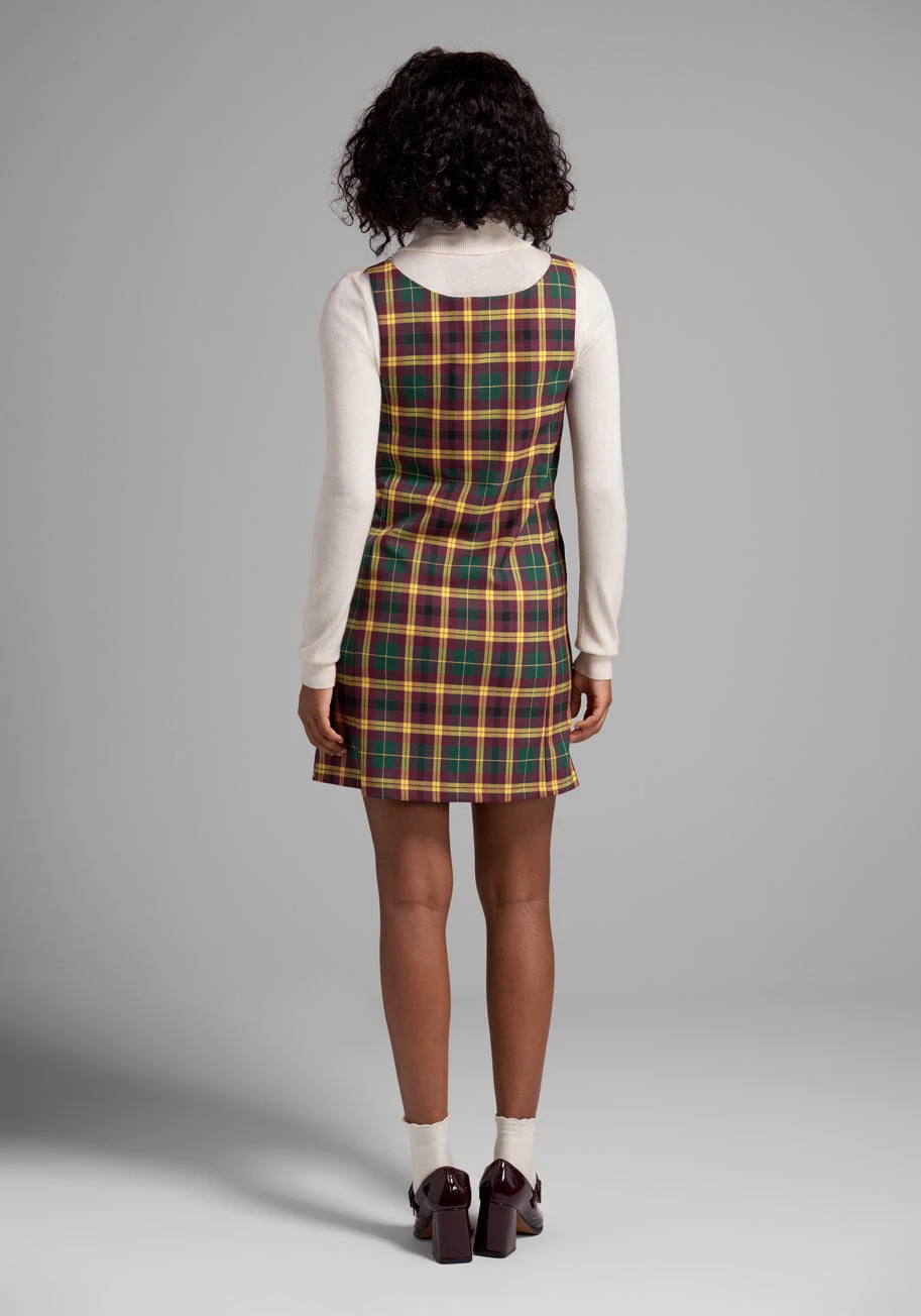 In an exclusive plaid print made up of rich and earthy tones of mustard, hunter green, and burgundy, you can’t get more retro than this fully-lined shift dress from our ModCloth namesake label! Made from a stretchy woven fabric, this sleeveless shift dress boasts front button-up closure, a curved V-neckline and a fabulous flared hemline at the knee-length skirt, complete with handy side pockets. The classic relaxed silhouette is perfect from adding warm layers in the colder months, and this easy A-line looks fresh and playful when worn alone as well!