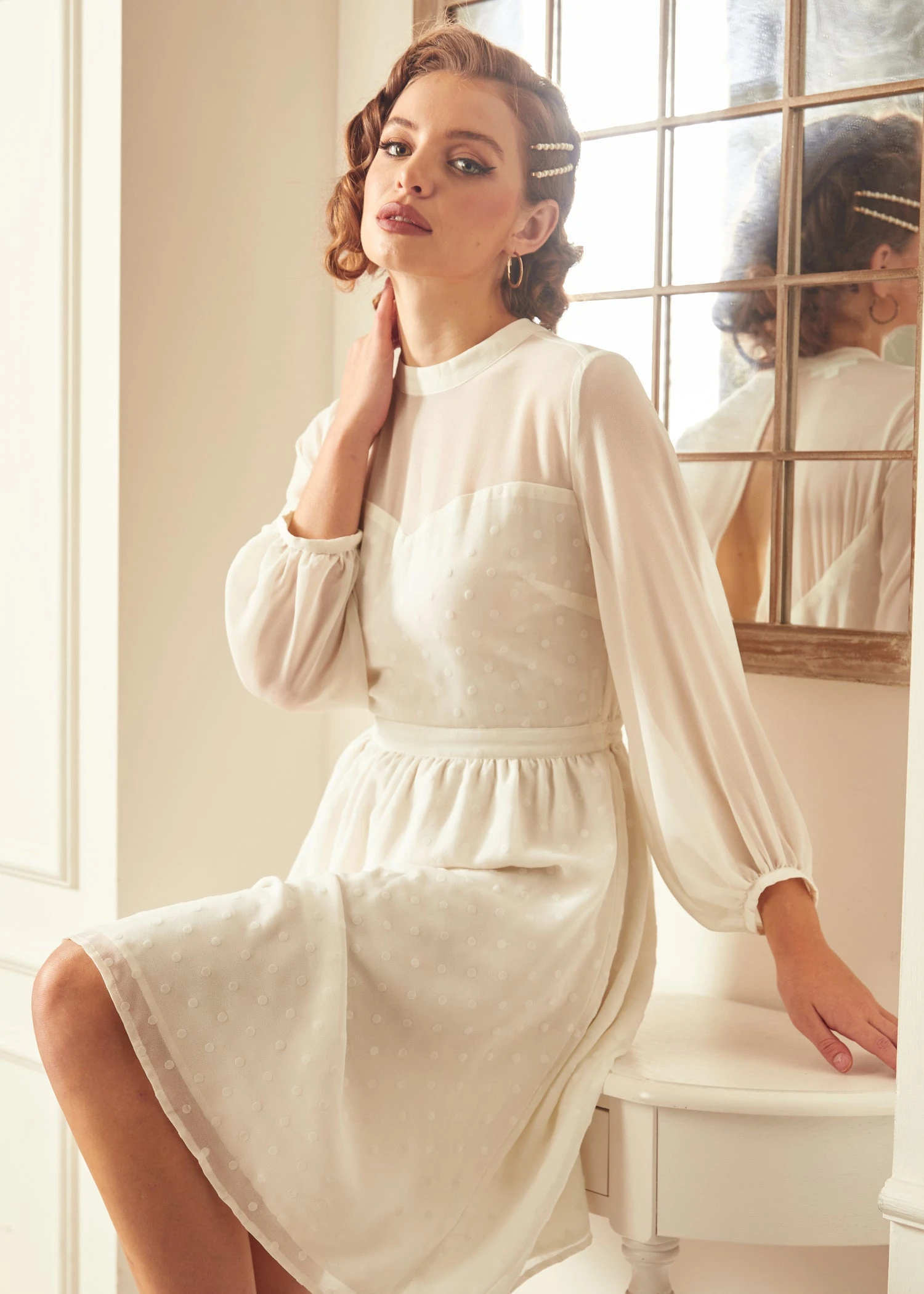 You’re such a stunner on your special day in this ivory-hued chiffon fit-and-flare dress from our ModCloth namesake label. To complement your effervescent elegance, this dress was created with a sheer yoke with a sweetheart silhouette at the chest line, sheer 3/4 blouson sleeves, and a high neckline with button closure that creates a keyhole cut-out to beautifully accent the back. The ivory bodice features an ivory polka-dot print that leads to a shirred high-waistline and a fabulous mid-length flare skirt. You are picture-perfect in this gorgeous A-line dress, and ready to celebrate a very precious occasion.