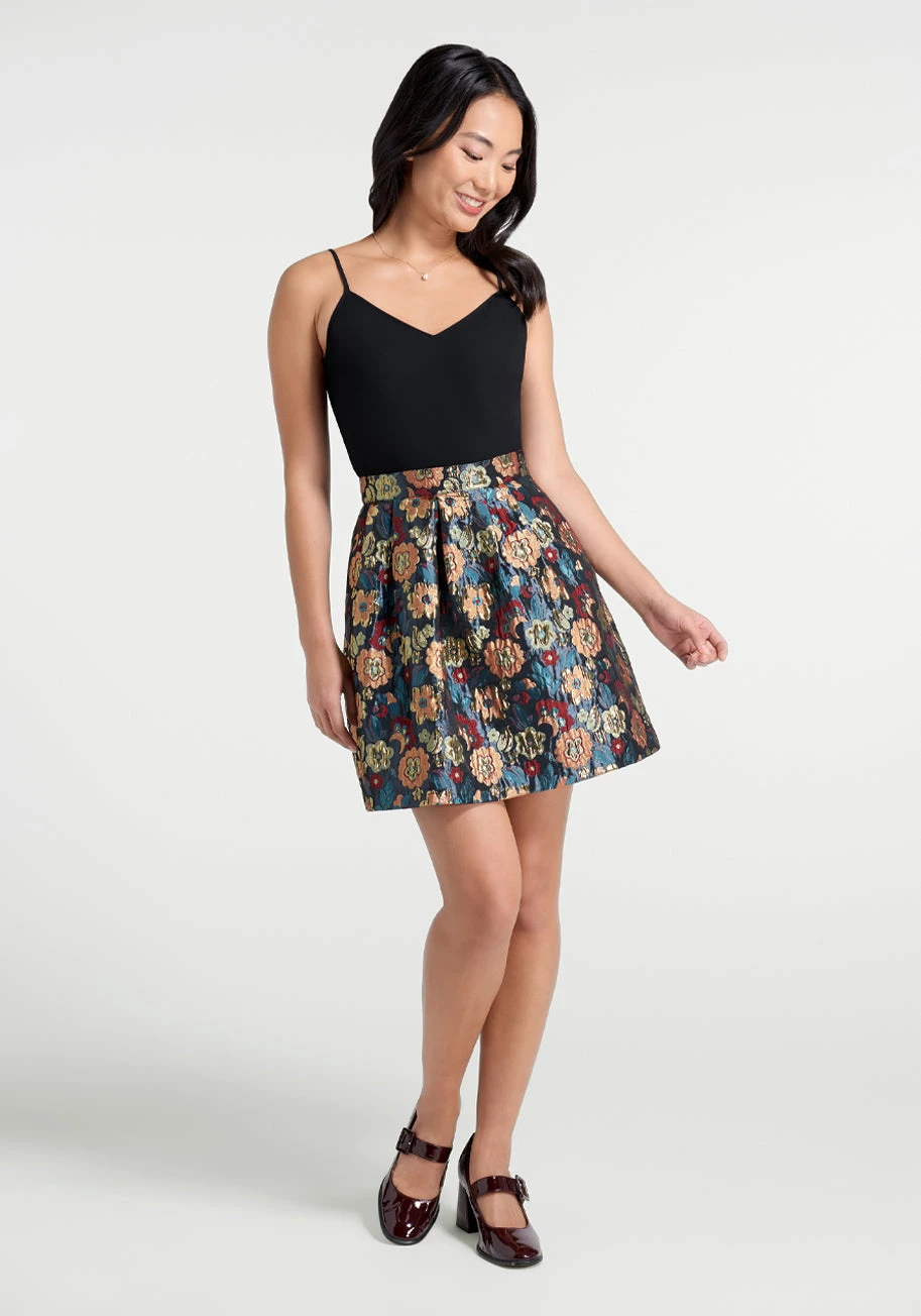 You’re sure to shine in this gorgeous pleated mini skirt from our ModCloth namesake label. Made from a shimmering brocade fabric showcasing a decadent array of bursting florals in moody holiday hues of burgundy, navy, peachy pink, and festive gold, this vintage-inspired skirt boast a high-rise waistline, side zip closure, handy side pockets, and a structured flare silhouette that finishes above the knee.