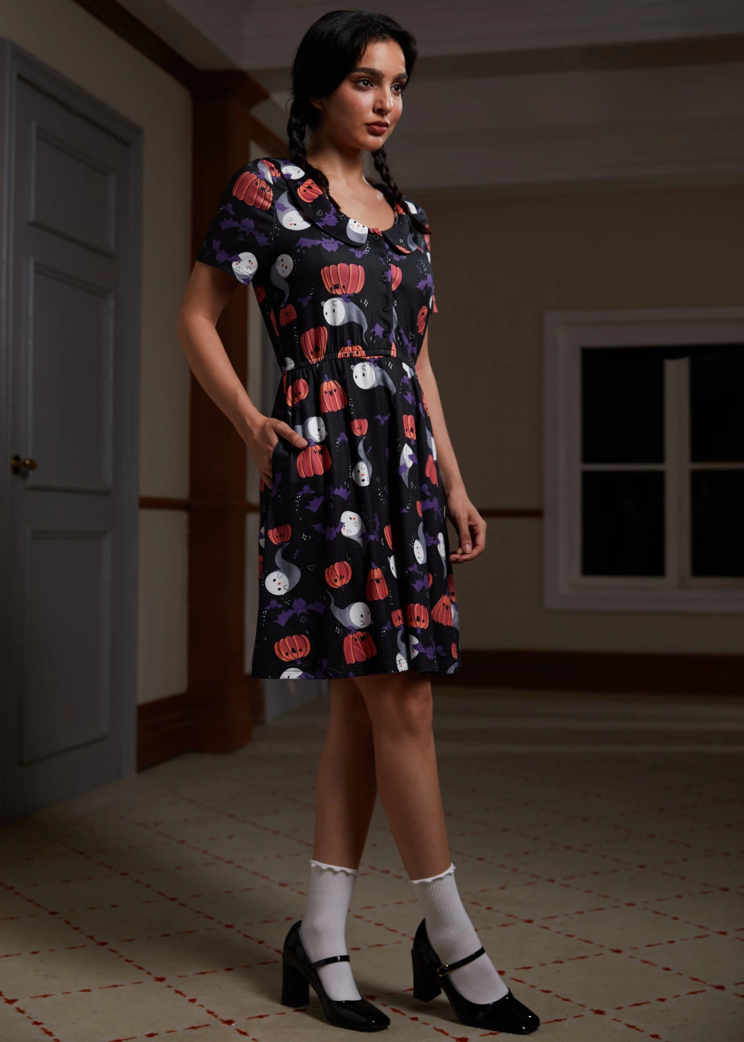 Sweet Shiver of Collared Dress from our ModCloth namesake label, adorned with a charming Halloween print, is the epitome of fall festivity. This dress, created from a cotton-like poly jersey knit with medium stretchability, features a playful button closure and an elastic waistband for a fit that’s both flattering and comfortable. Perfect for Halloween parties or a whimsical day at work, this dress encapsulates the enchanting spirit of the season in every stitch.