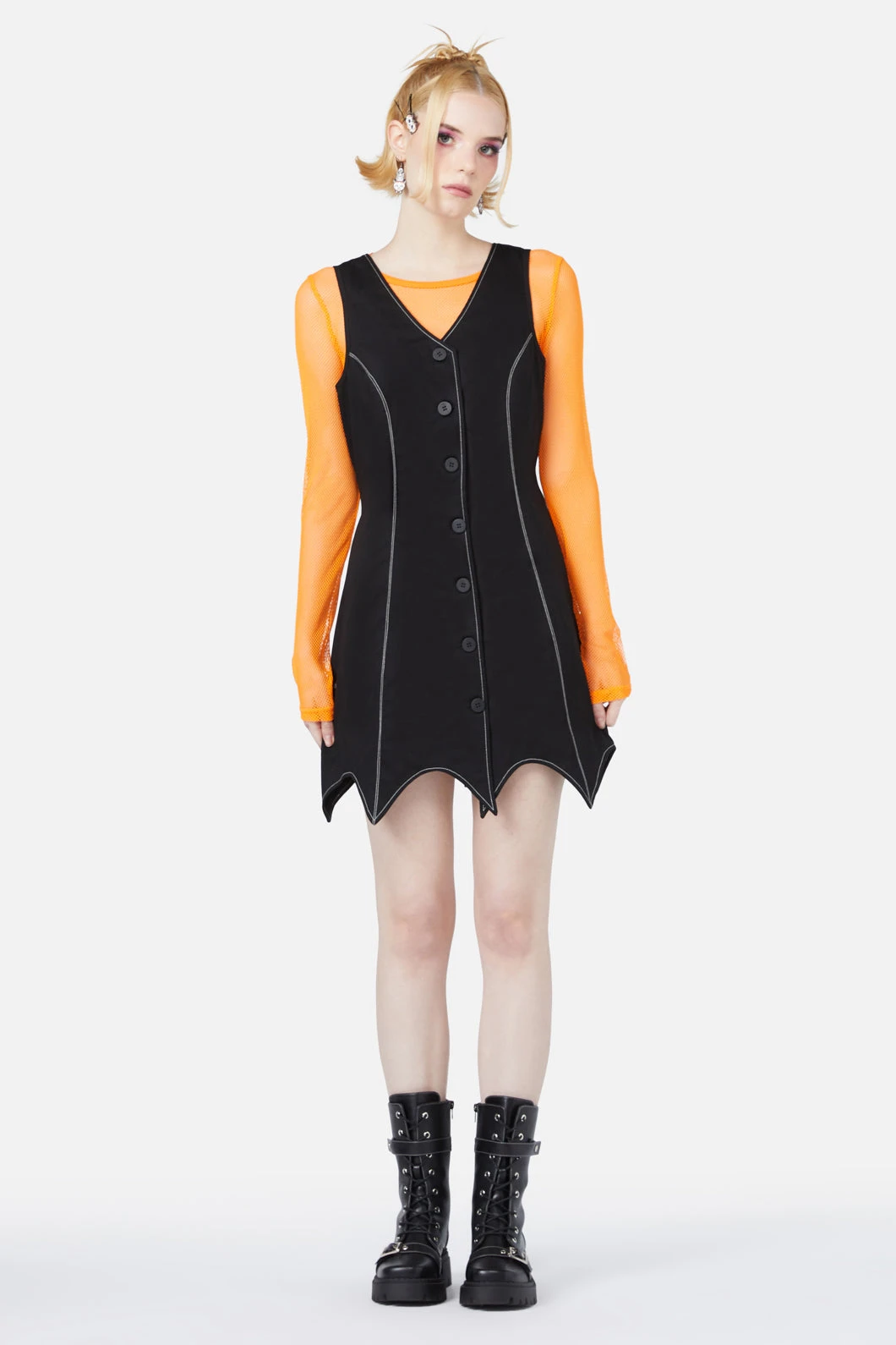 Unleash your inner goth queen with the Verona Pinny, a bold and edgy gothic pinafore designed to make a statement. This sleeveless stunner features a fitted shape and a dramatic V-shaped neckline, perfect for layering over your favorite tops. The button-down placket at the front adds a classic touch, while the pointy, spiky hemline injects an extra dose of attitude.