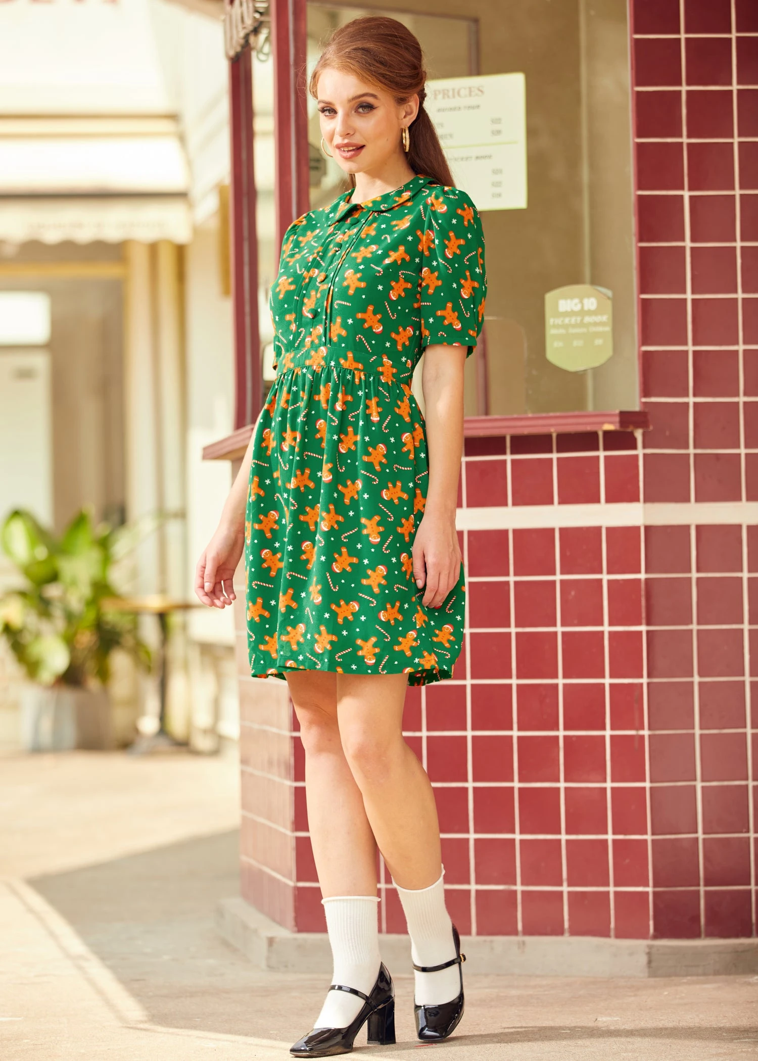 Let this whimsically festive, green dress from our ModCloth namesake label be the happy thought that makes your holiday spirits soar! Made from a lightweight woven fabric and boasting an exclusive hand-drawn print of gingerbread cookies playfully tumbling amidst candy canes and snowflakes, this retro-fab frock is an instant holiday classic! Featuring a darling Peter Pan collar, a placket of fabric-covered buttons at the front bodice accented by pintuck bib-front, short puff sleeves with buttons cuffs, and a gathered waist that adds just the right amount of fullness to the skirt, this fabulous A-line will be a favorite for many winter seasons to come.